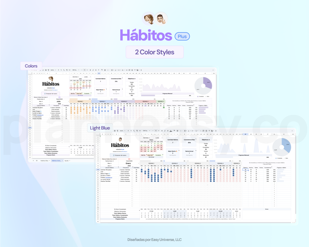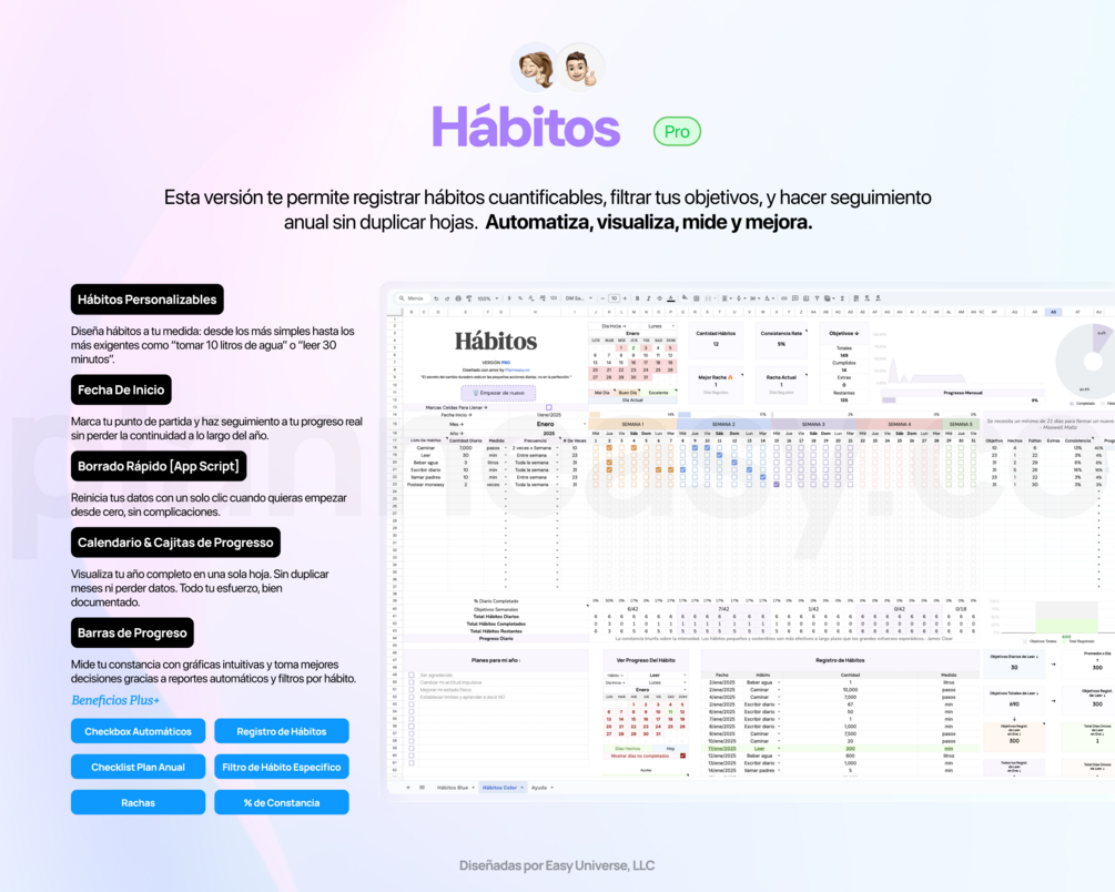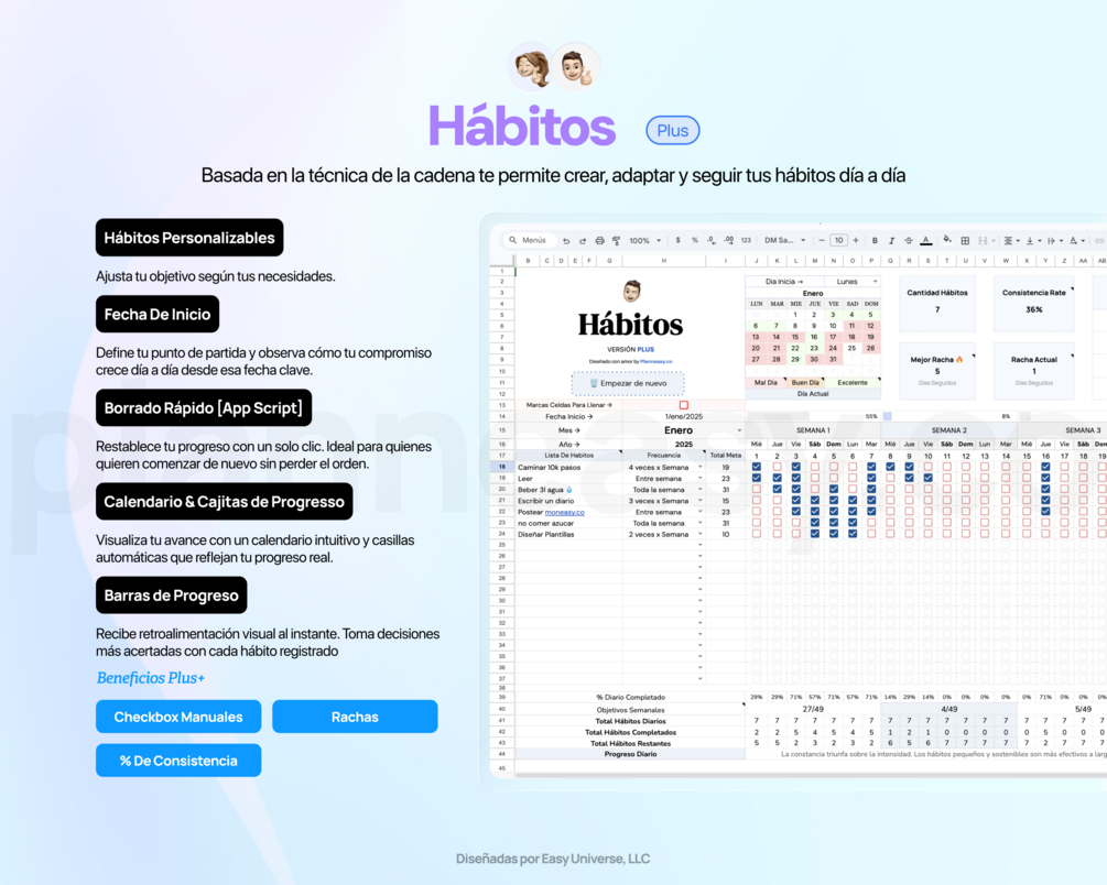Esta plantilla incluye La técnica de la cadena, una herramienta poderosa para construir y mantener hábitos. Esta estrategia te permite visualizar claramente tu progreso diario, motivándote a no romper la cadena.